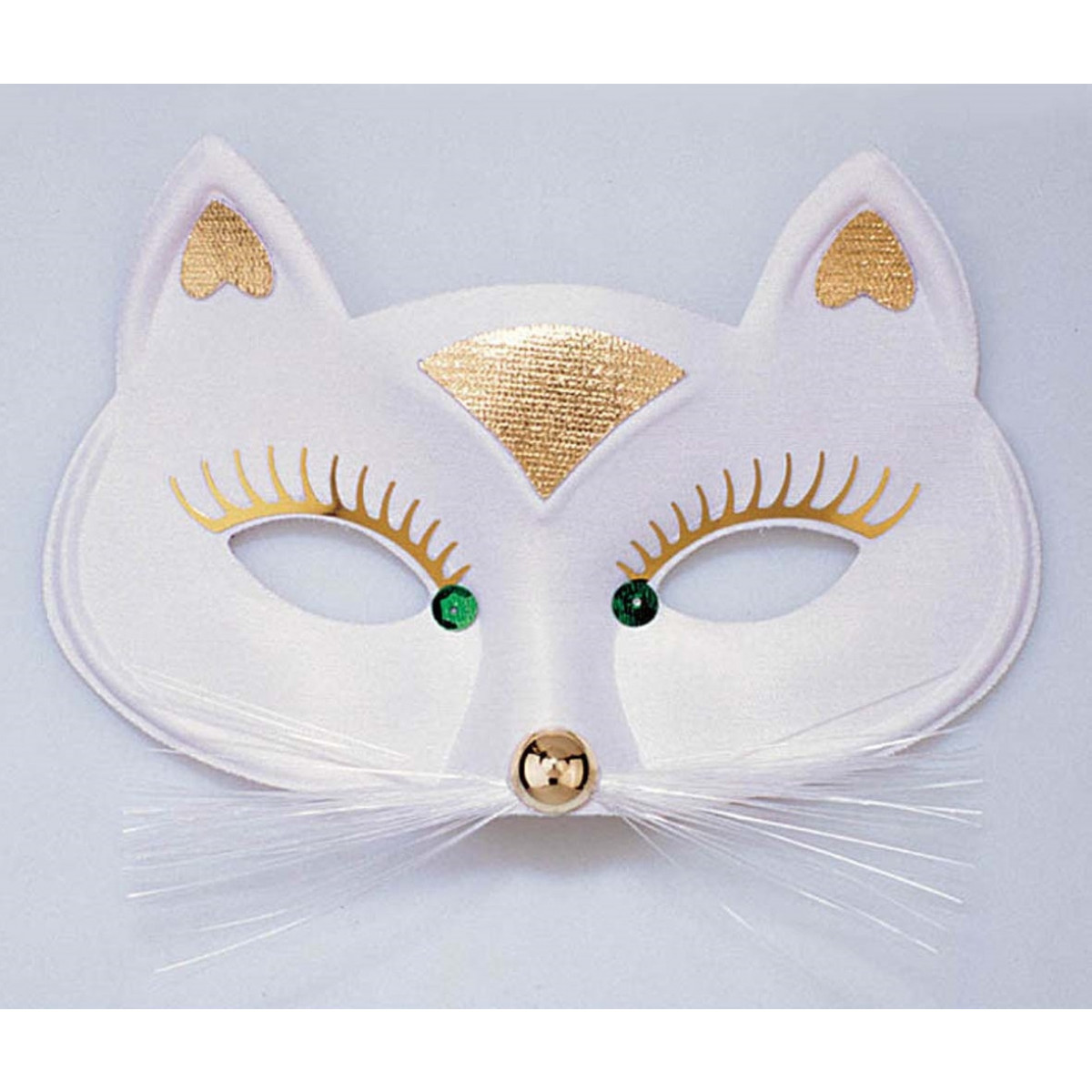 Krinka mačka je bele barve z zlato poslikavo. Na vsakem ušesku je narisam po en zlat srček. Nos je zlat in iz njega so izpeljane brčice. Lepa maska v stilu azijskih mačk. Priporočamo! Krinka mačka z brčicami, v dveh barvah.