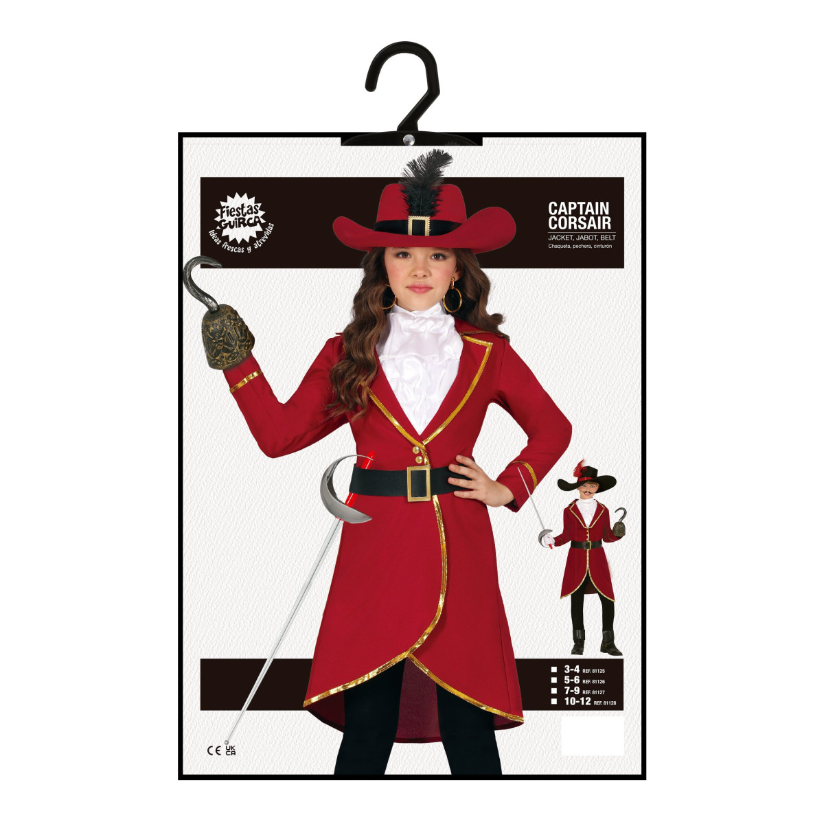 Kapitanka Piratka je popolna izbira za deklice, ki sanjajo o piratskih dogodivščinah. Komplet vključuje rdeč suknjič z zlatimi robovi, bel nabran ovratnik (jabot) in črn pas z zaponko. Udoben kroj in kakovostni materiali zagotavljajo prijetno nošenje skozi celoten dan.