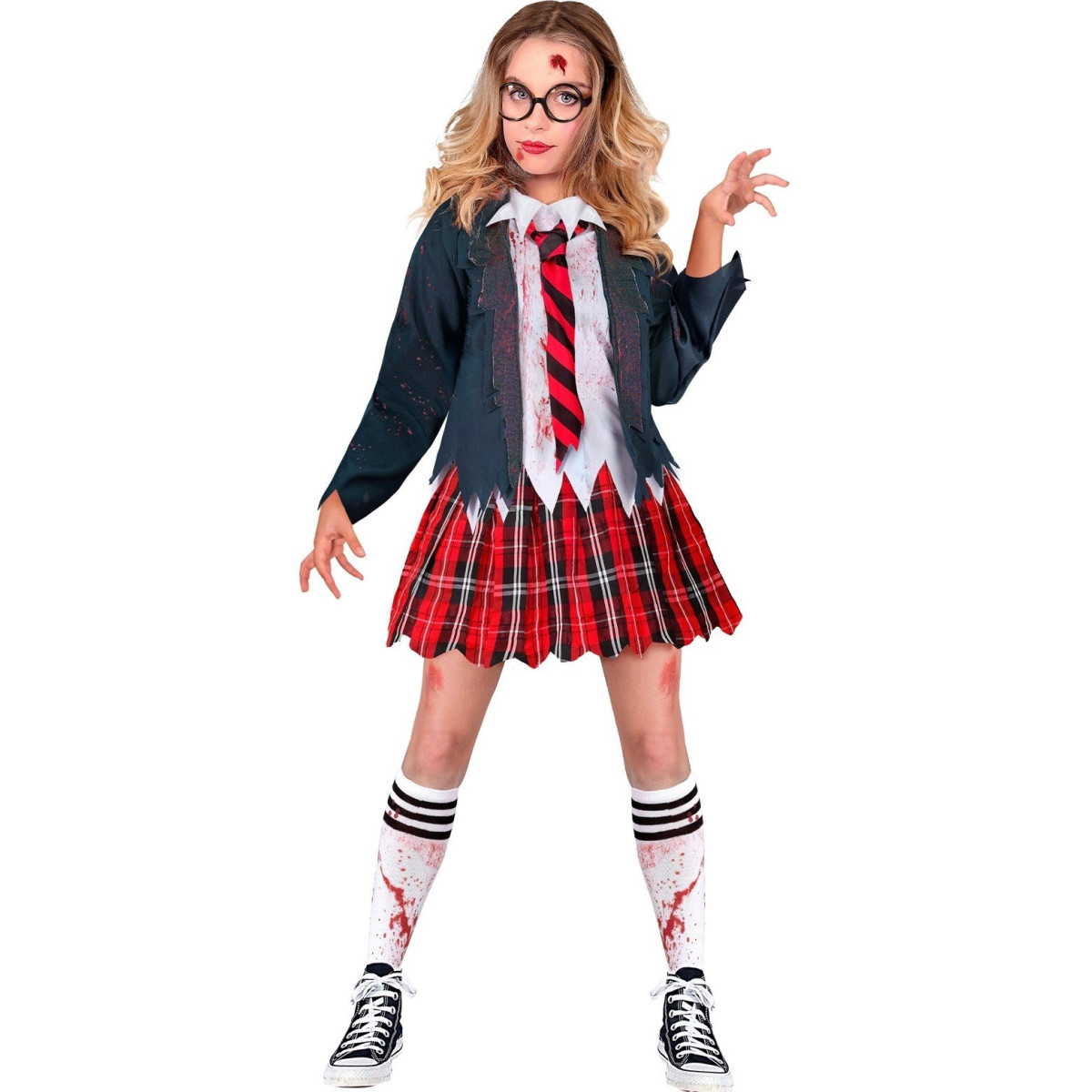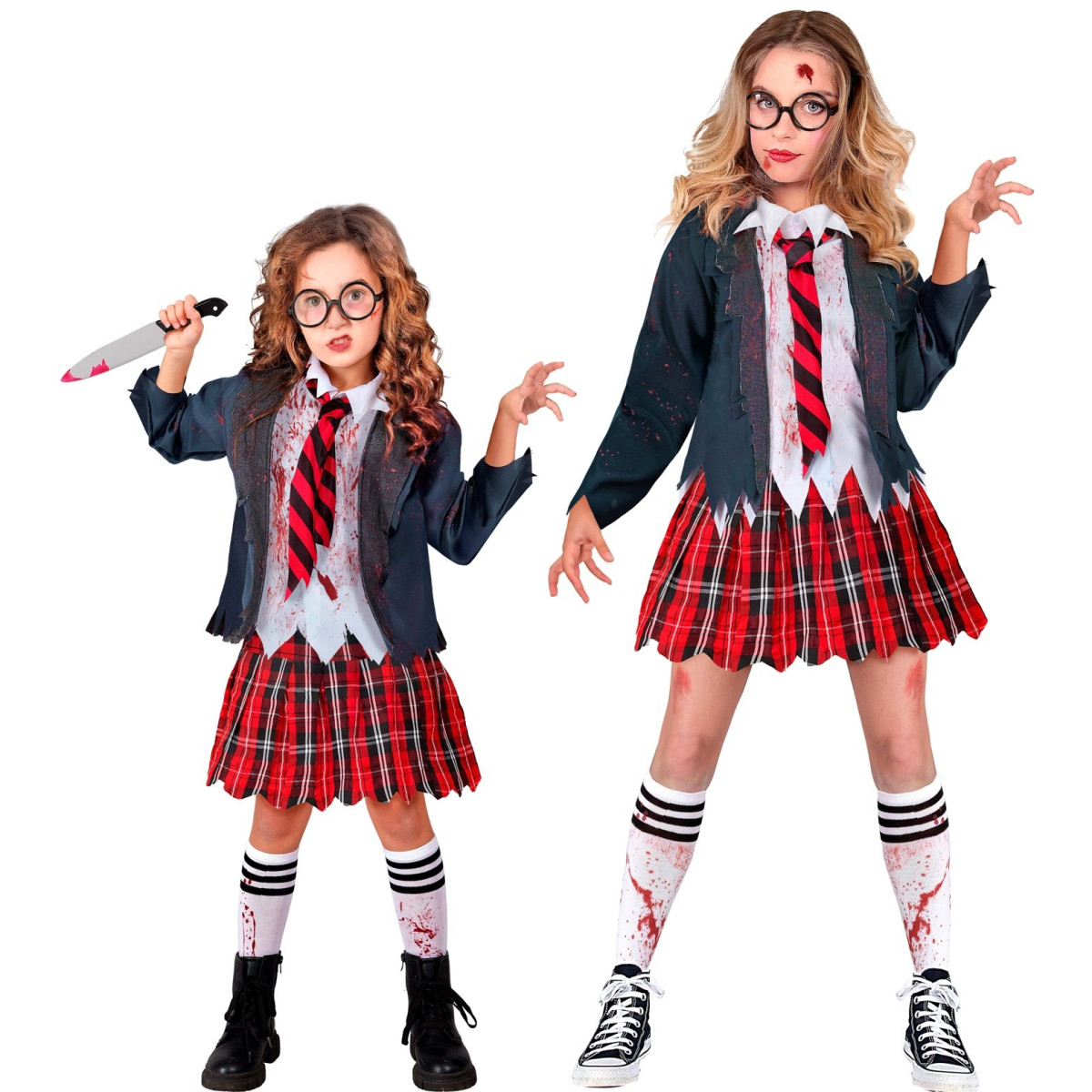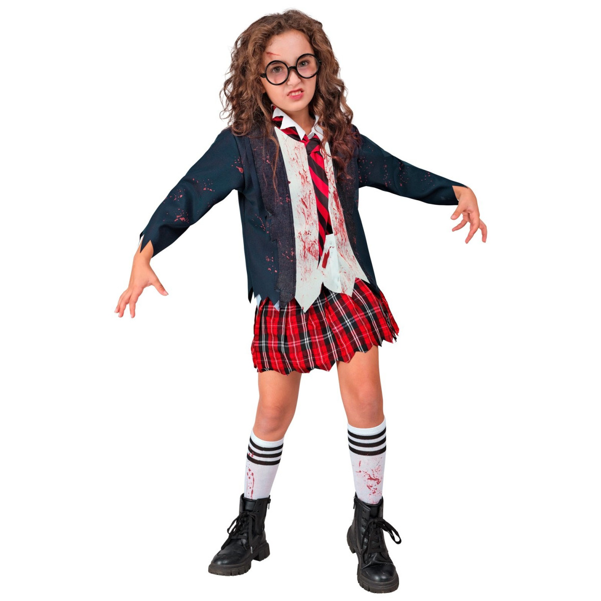 Ko se v šoli ugasnejo luči, hodniki zaživijo … in med njimi se pojavi vaša mala zombi šolarka! Kostum vključuje raztrgano jakno s prišito srajco, rdeče karo krilo, črtasto kravato in bele nogavice, ki so videti, kot bi jih pobarval pravi filmski mojster grozljivk.  Popolna kombinacija otroške igrivosti in zabavne groze!