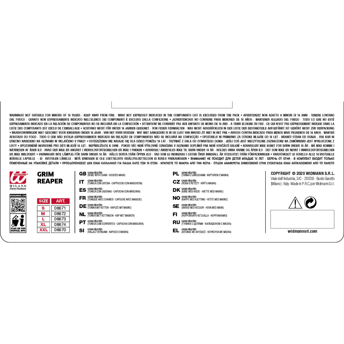 Posebno krojen pustni kostum za smrt s koso ima verigo všito kar v kostum. Z dolgih rokavov pa visi temna prosojna tkanina, ki veča občutek groze. Z motivom kosti na prsne delu, boste vse prepričali v svoj lik. Poleg pustnega sprevoda, ga lahko oblečete tudi za Halloween. Pustni kostum vsebuje tuniko z všito verigo, masko s kapuco.
