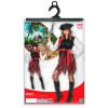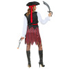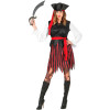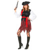Gusarski kostum za dame – Prebudite svojo notranjo gusarko z našim ženskim piratskim kostumom. Eleganten in prefinjen, ta kostum zajema belo majico z dolgimi rokavi in črnim jopičem za enostavno preobrazbo v gusarsko kapitanko. Poudarjen pas v kričeče rdeči barvi dodaja pridih morja in avanture, medtem ko črno-rdeče črtasto krilo vihra v pustnem vetru. Naglavni trak in ikoničen gusarski klobuk zaključujeta kostum. Vsaka piratka bo v kostumu zasijala kot kraljica sedmih morij.