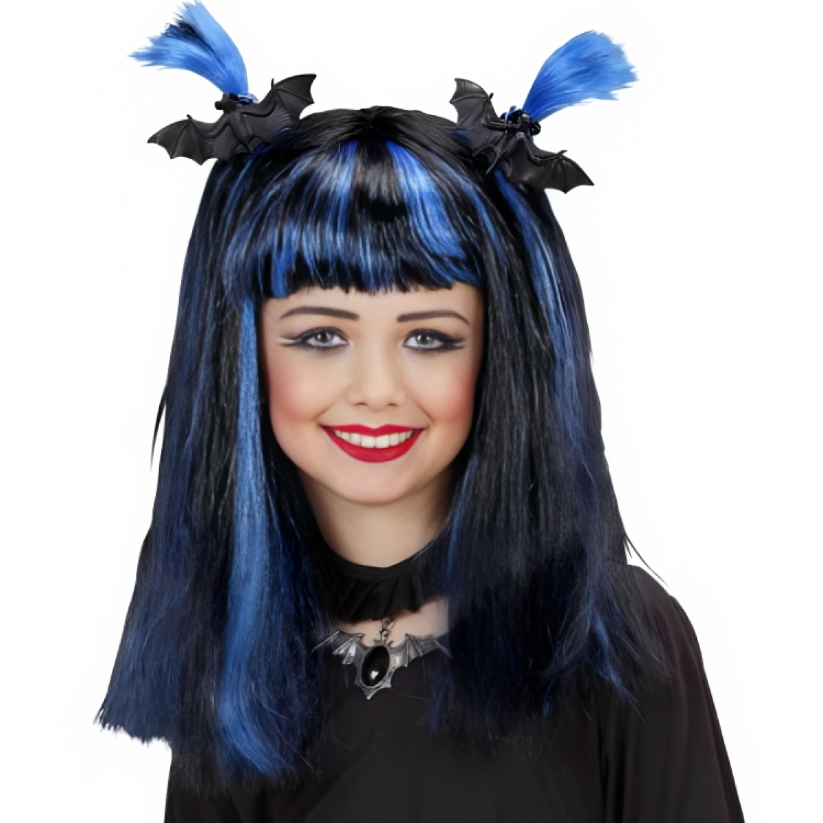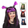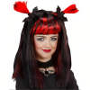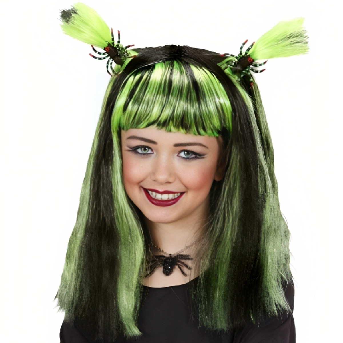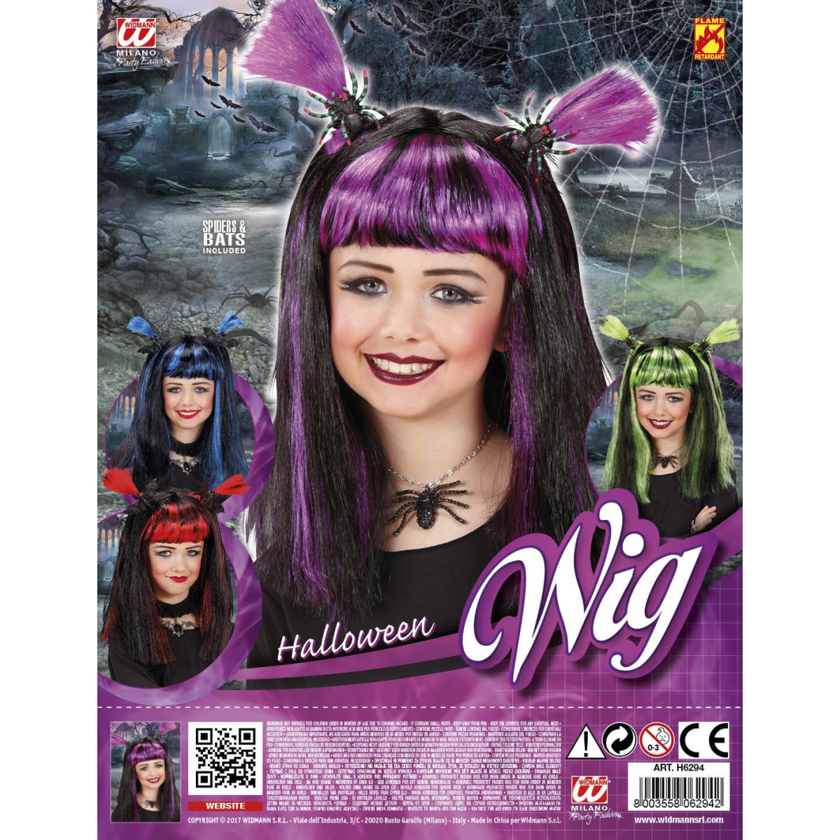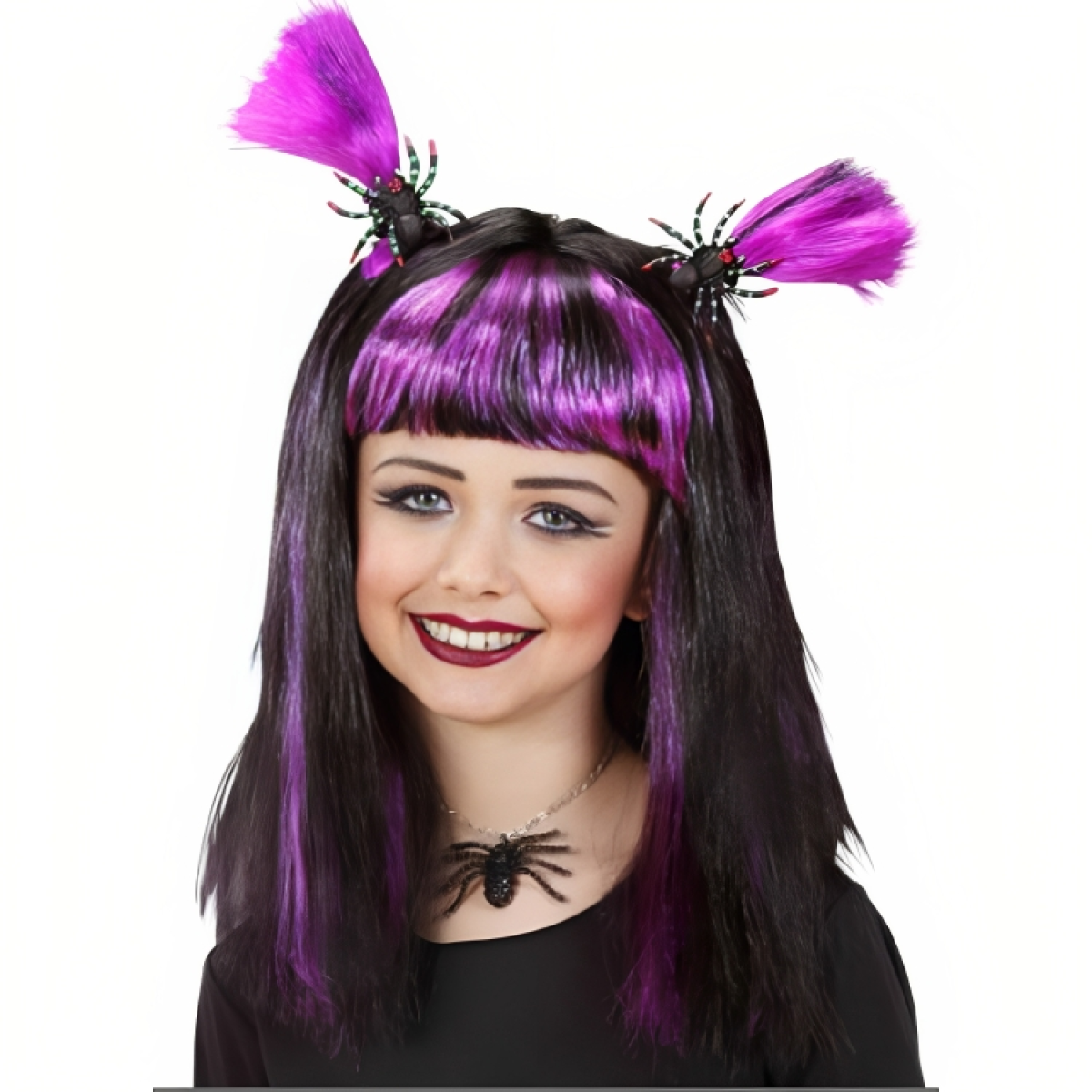 Otroška pustna lasulja Halloween ima na živahnih čopkih dva pajka, ki ustvarjata občutek groze. Sicer pisana lasulja, je primerna za pusta ali noč čarovnic. Dekliška pustna lasulja Halloween s čopki in barvastimi prameni.