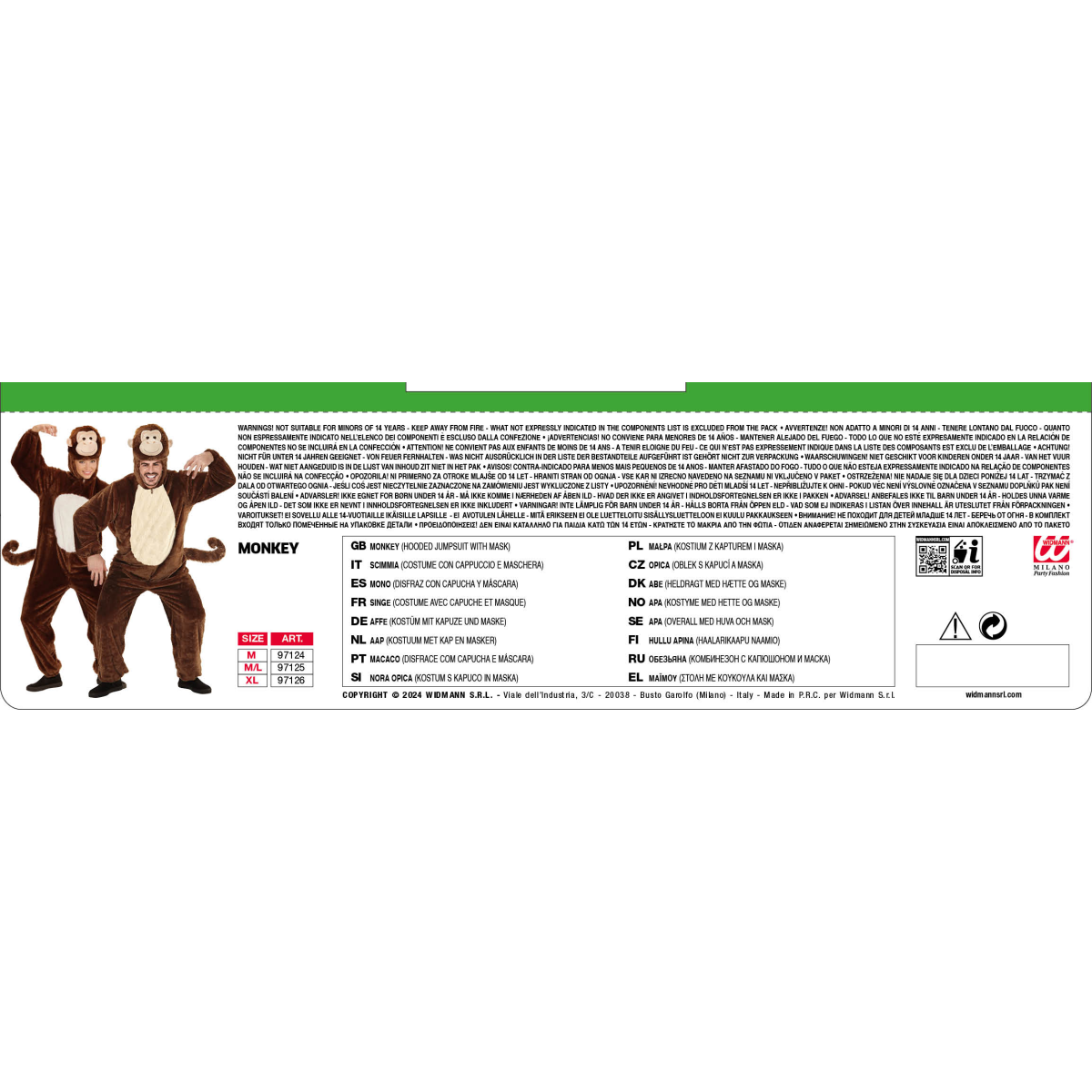 Odrasli kostum opica je narejen iz mehkega in udobnega pliša, kar omogoča prijetno nošenje. Gre za enodelni kombinezon, ki se enostavno obleče in zagotavlja popolno prekrivanje telesa. Kapuca je oblikovana z opičjo glavo, kar doda zabaven in realističen videz.