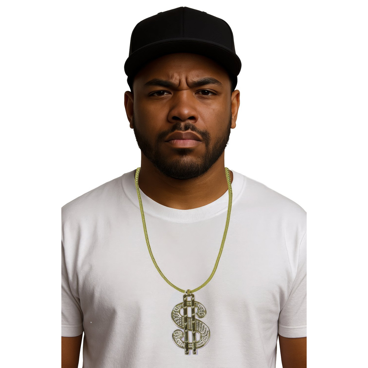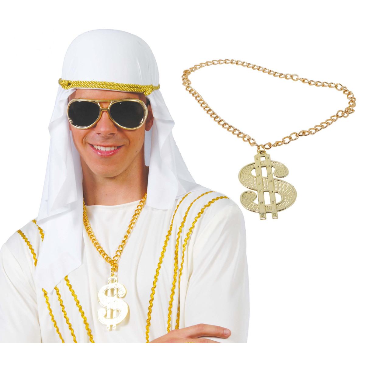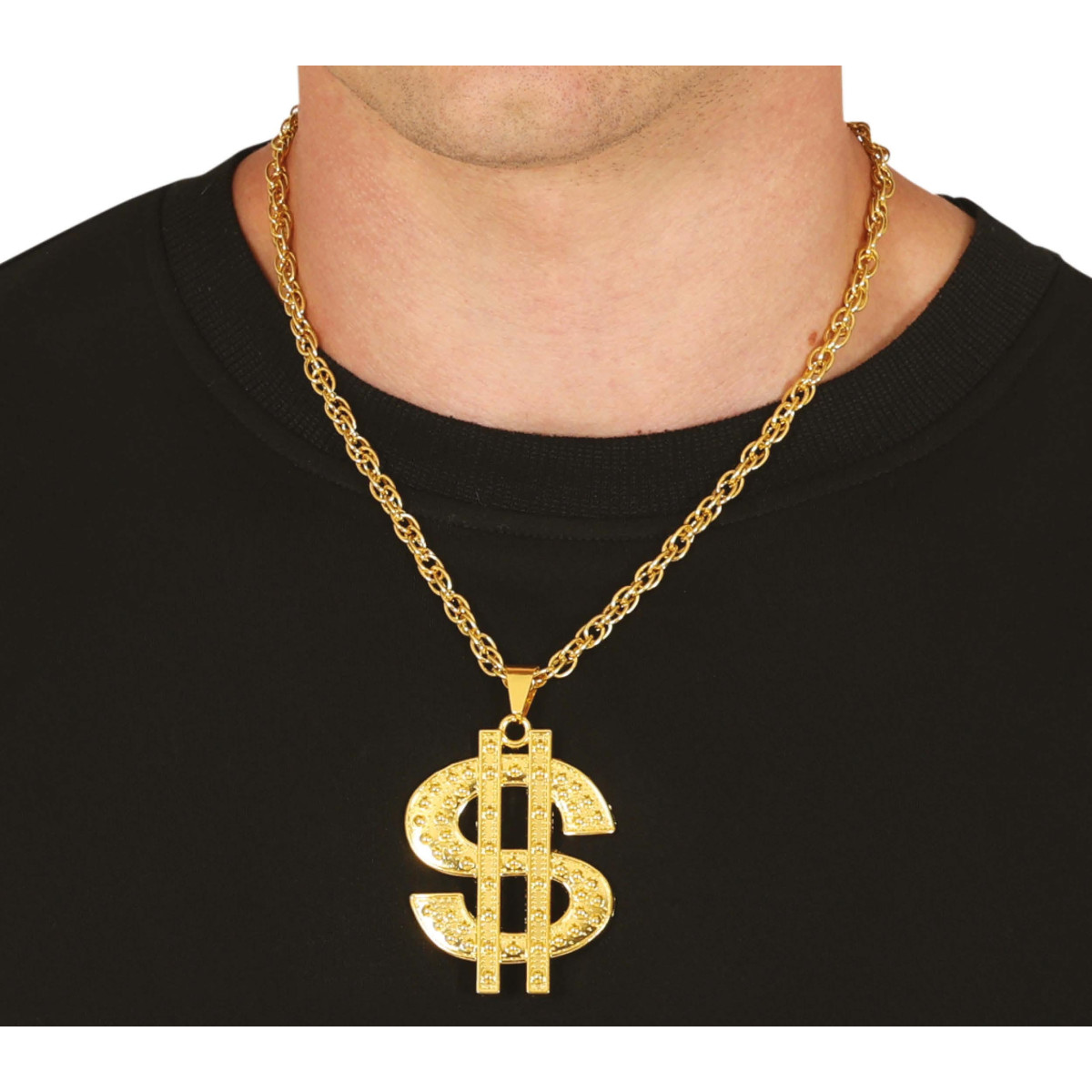 Verižica z obeskom dolarja je kovinski modni dodatek, ki takoj pritegne pozornost in poudari drzen značaj kostuma. Kovinska verižica z izrazitim obeskom v obliki znaka dolarja, velikosti 5 cm, daje videz razkošja in moči. Odlična izbira za like Šeika, Reperja, bogataša ali gangsterja.