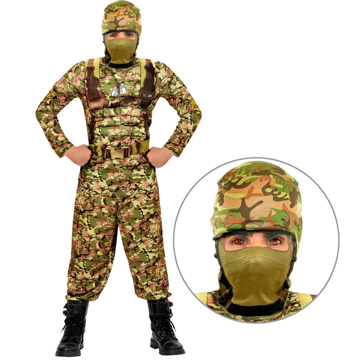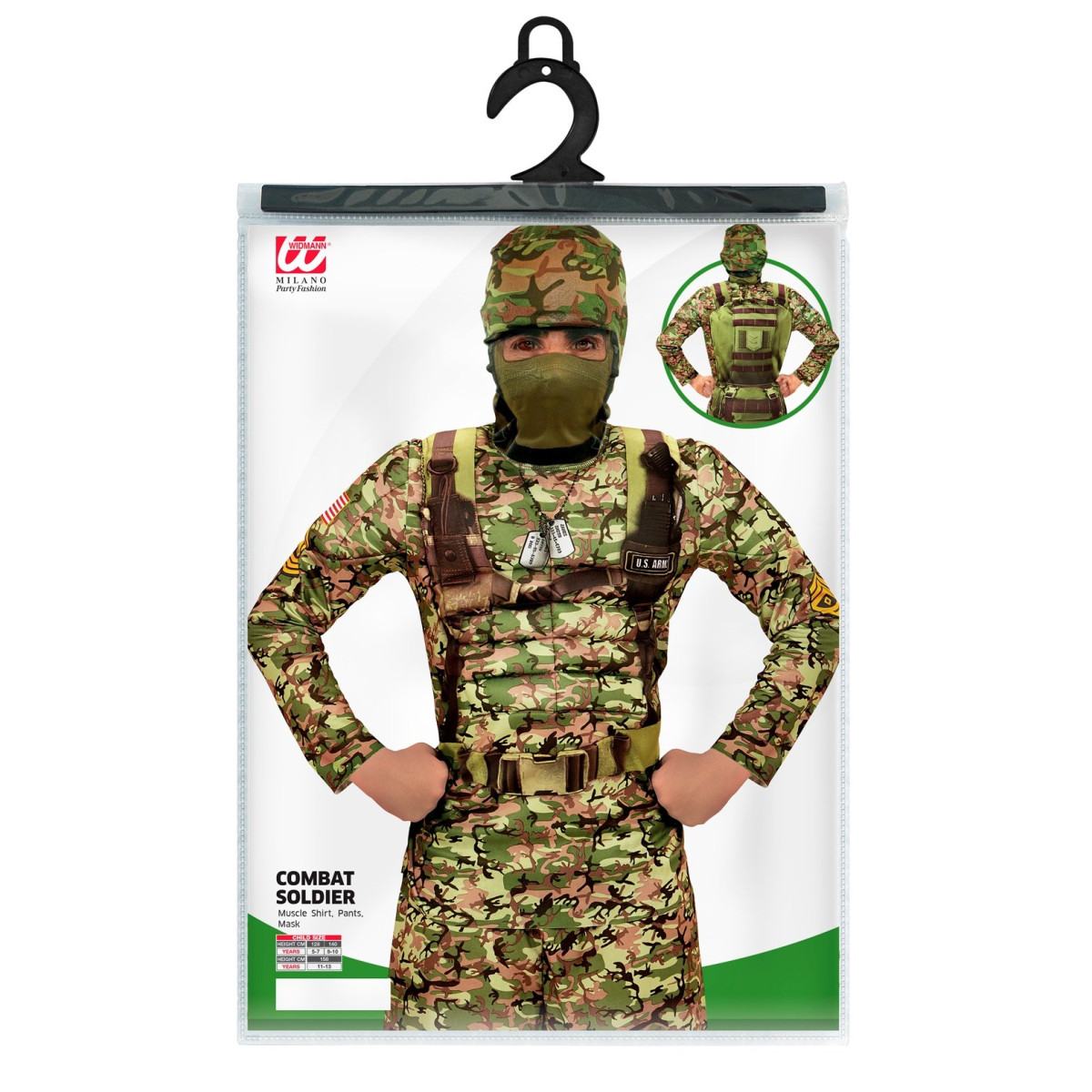 Otroški pustni kostum vojaka Combat Soldier bo vsakega otoka popeljal v svet pogumnih misij. Komplet vsebuje vojaško potiskano majico z detajli nahrbtnika in naramnic, hlače ter kapuco z masko. Realističen potisk in udobno prileganje omogočata, da se mali vojak popolnoma vživi v svojo pustolovsko vlogo.
