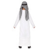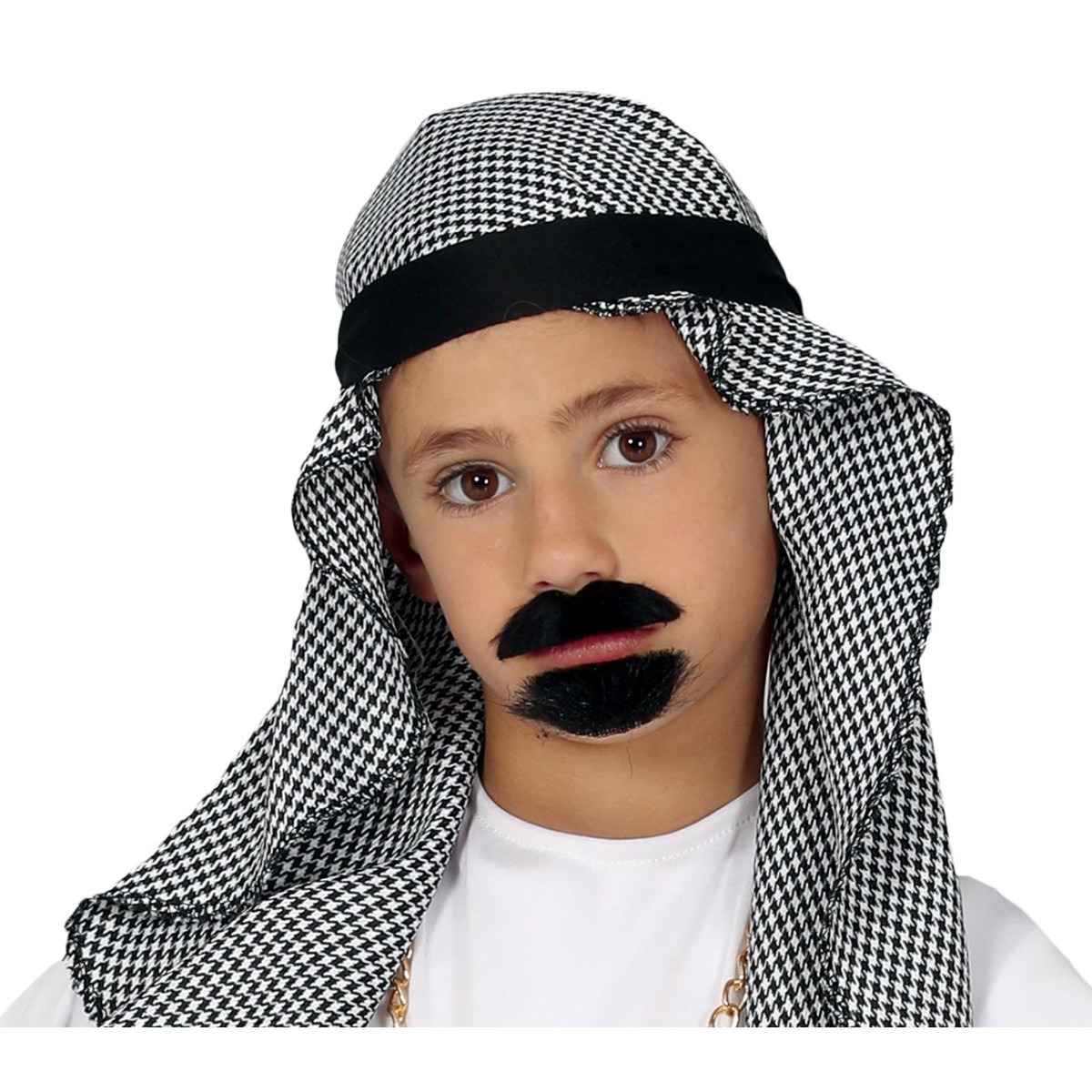 Naj vaš otrok zasije v vlogi čisto pravega šejka! Kostum vključuje dolgo belo tuniko in značilno črno-belo naglavno ruto z elastičnim trakom, ki poskrbi za pristen videz arabskega princa.