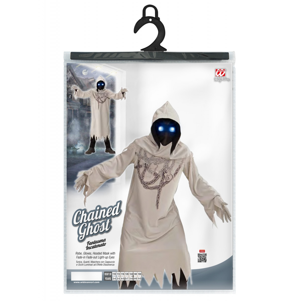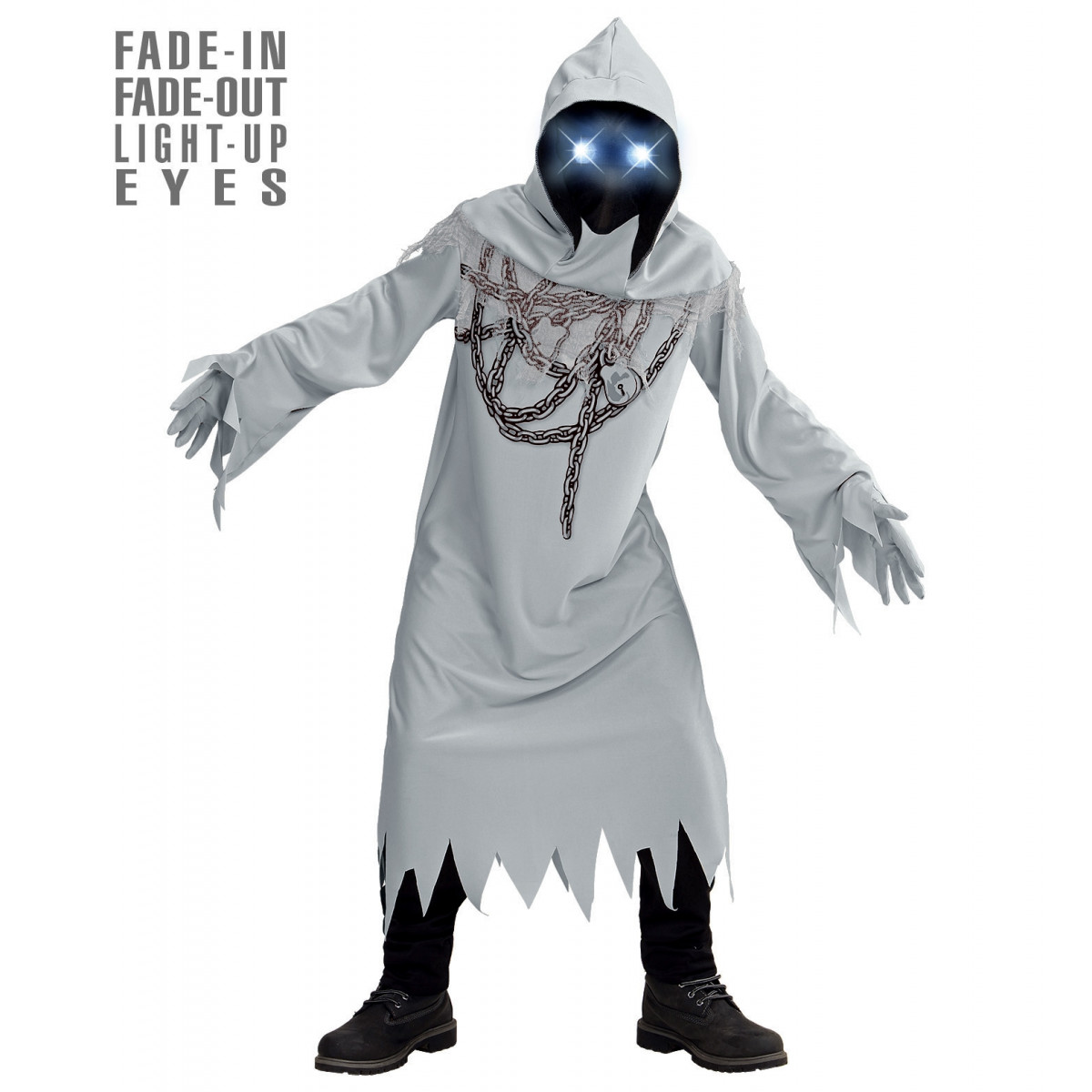 Svetlo siv strašljiv pustni kostum za otroke! Pustni kostum grozni duh s sijočimi očmi! Kostum vključuje obleko, rokavice in masko s kapuco. Kostum ima tudi ločen trak s svetlobnimi očmi, ki ga je treba postaviti pod masko. Lučke se samodejno ugasnejo.