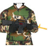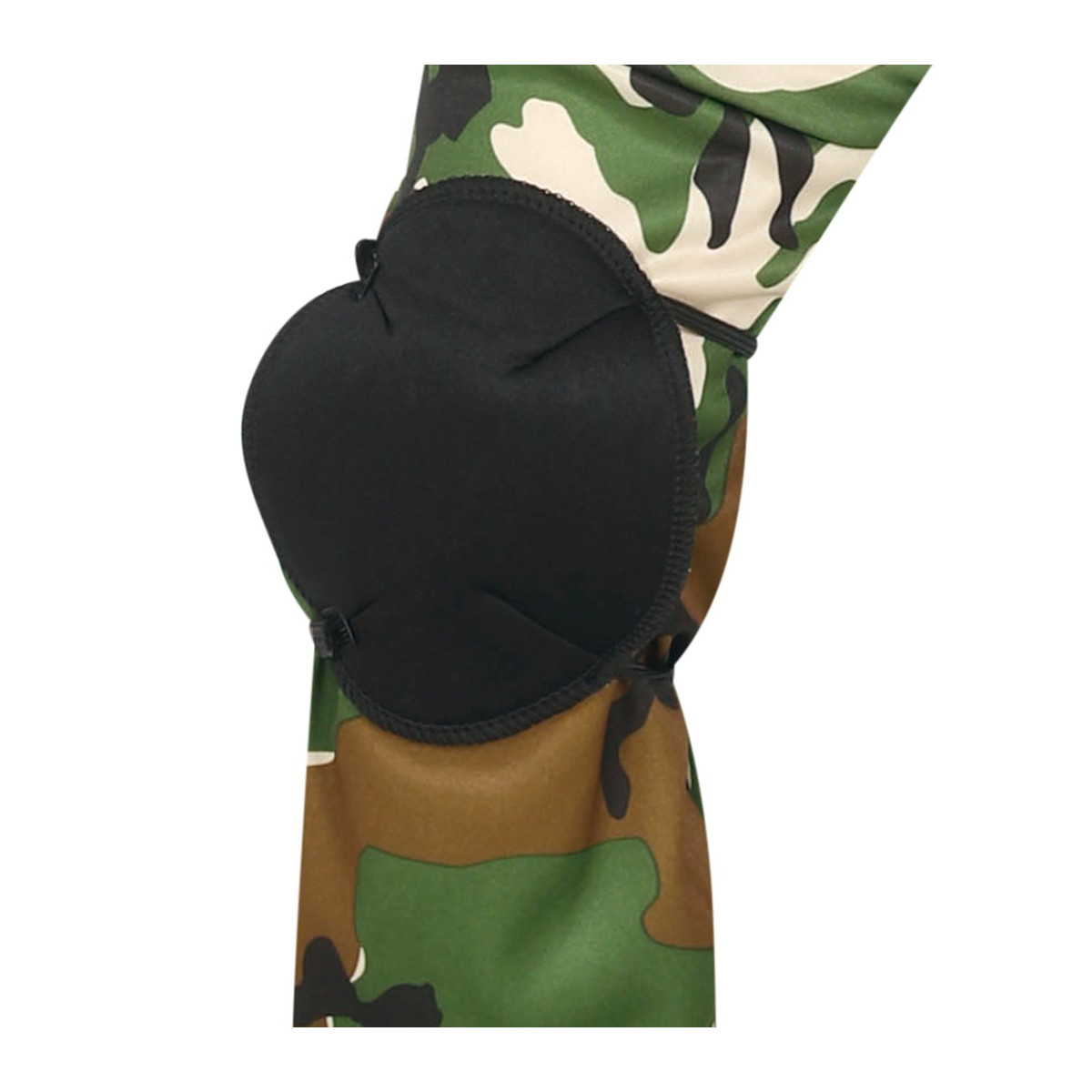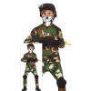Set vključuje: maskirno tuniko, hlače, zaščitni brezrokavnik, kolenčnike in vojaški šal.