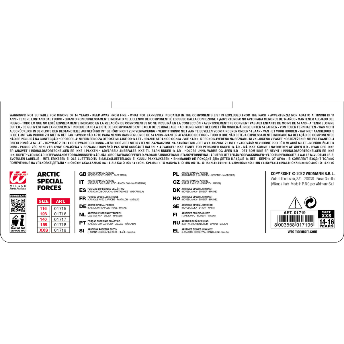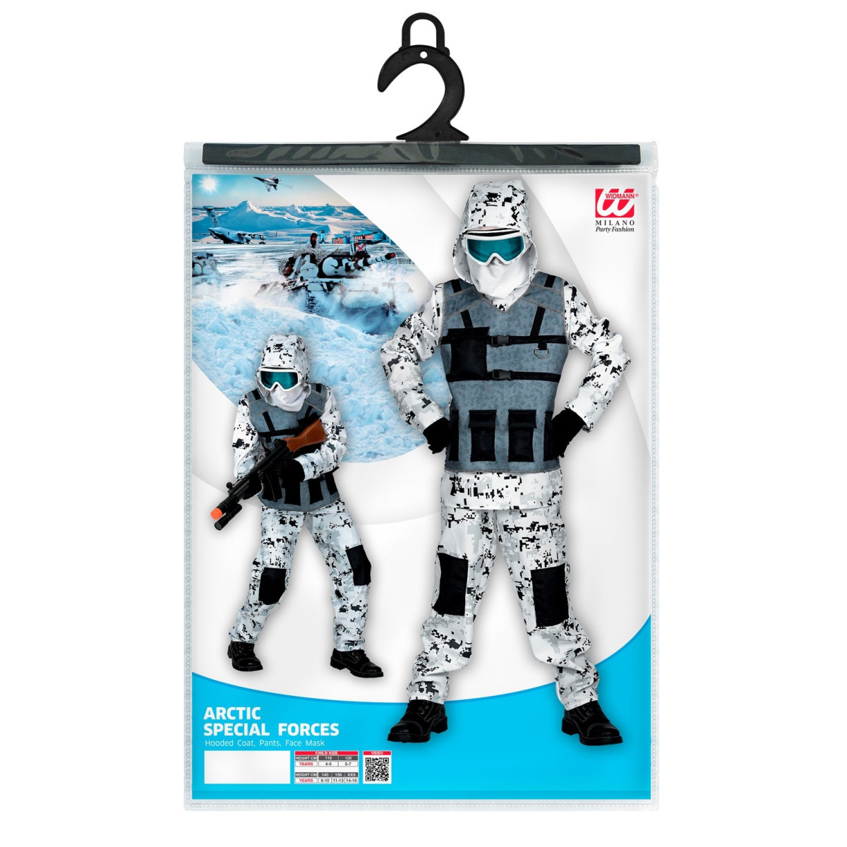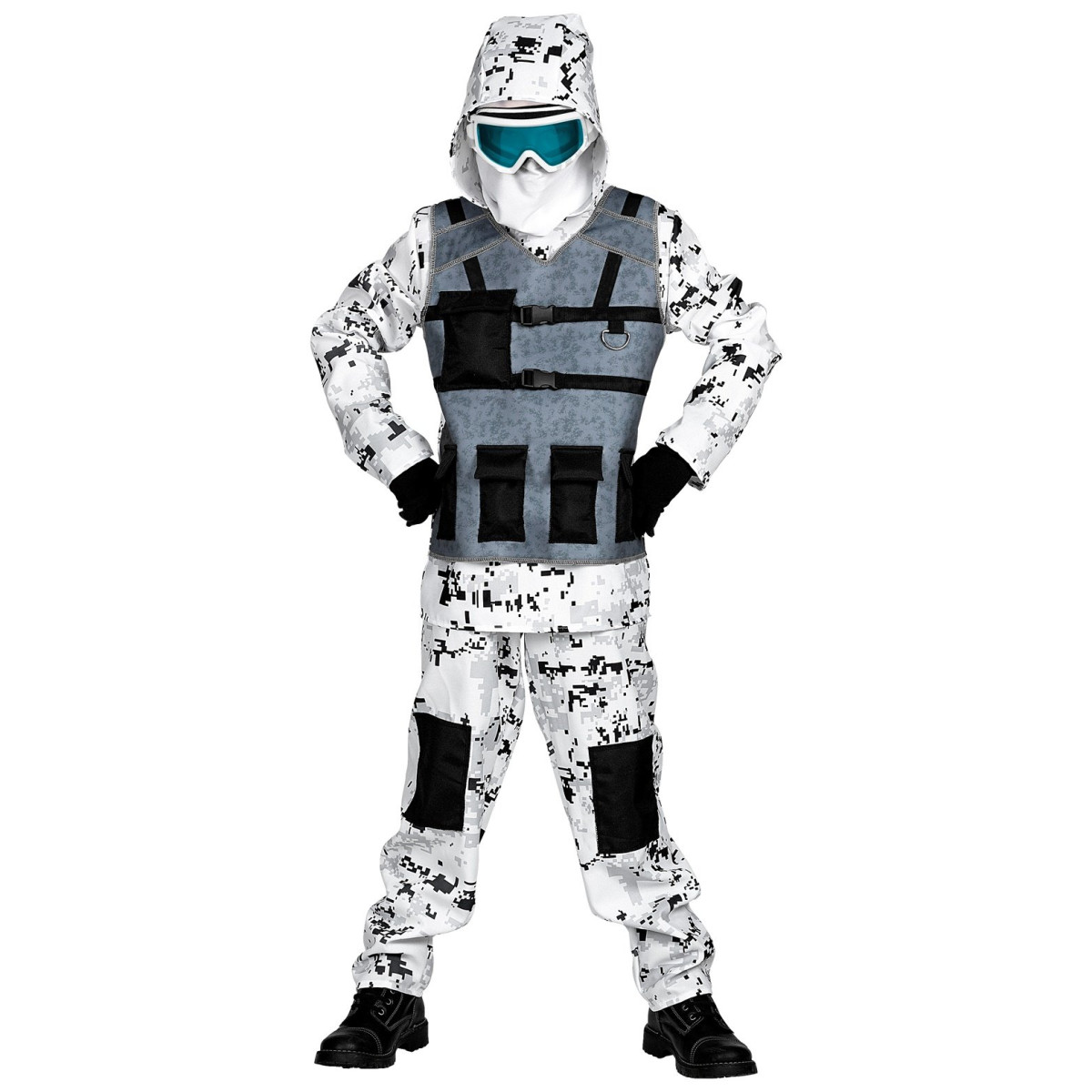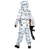 Fantovski kostum Arktični specialni vojak, bo navdušil vse mlade pustolovce. Celoten komplet je v beli maskirni barvi s črnimi vzorci, kar posnema arktično kamuflažo in omogoča realističen videz.