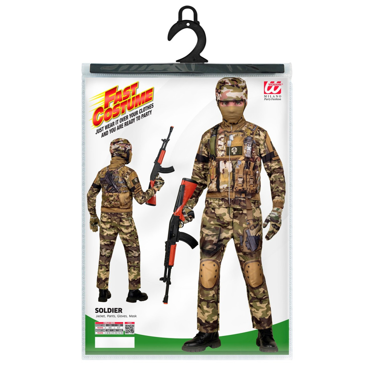 Otroški pustni kostum vojaka je potiskan komplet v maskirnem vzorcu, ki bo navdušil vse male junake. Vsebuje vojaško jakno, hlače, rokavice in masko, ki skupaj ustvarijo realističen videz vojaka. Ker je kostum izdelan iz lahkih materialov in ima udoben kroj, omogoča nemoteno gibanje in celodnevno nošenje. Odlična izbira za pustne zabave, šolske nastope ali tematske igre doma.