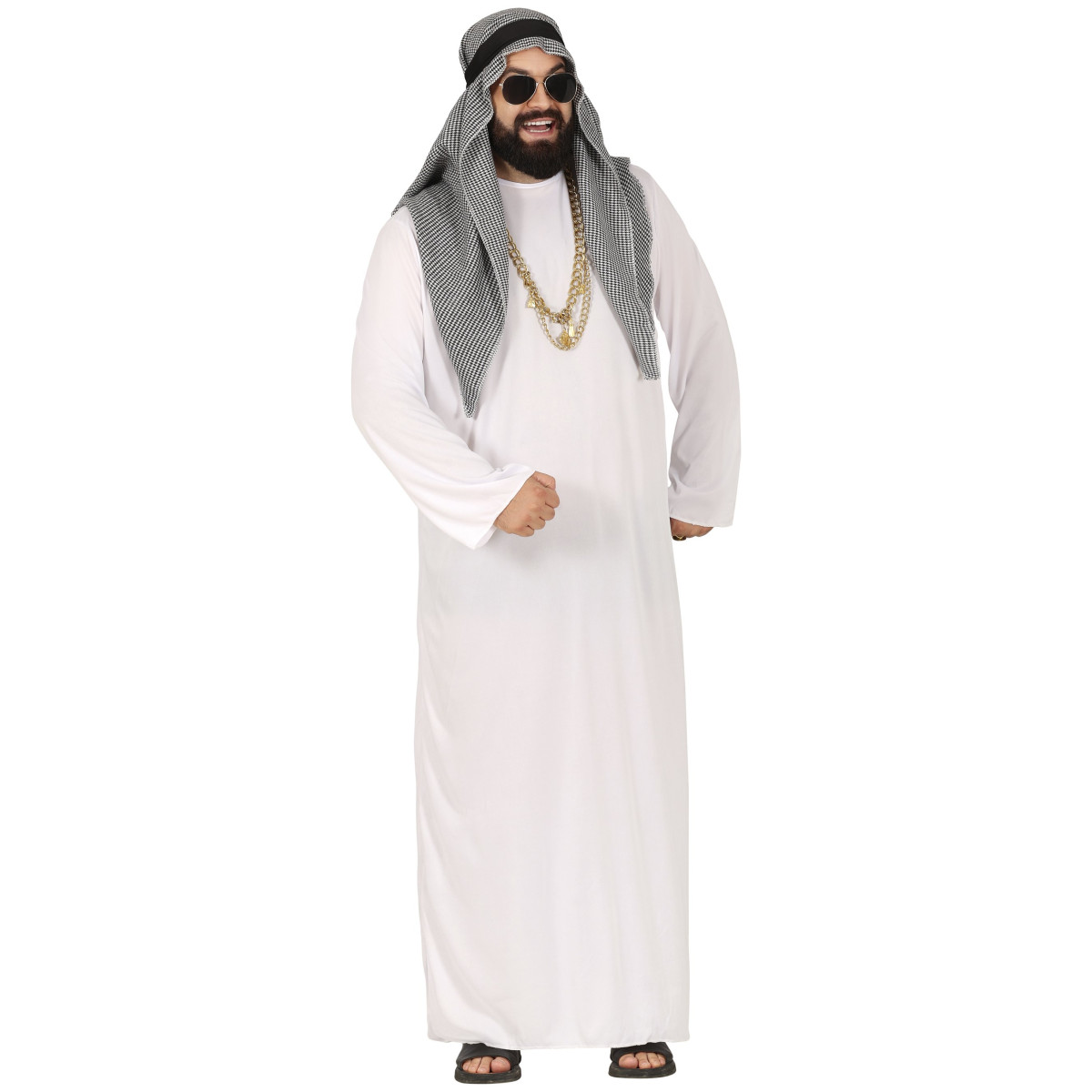 Moški pustni kostum arabskega šejka predstavlja klasičen orientalski videz. Kostum sestavlja dolga bela tunika ter značilna ruta z naglavnim trakom, ki skupaj ustvarijo prepoznaven videz arabskega šejka. Krojen je preprosto in omogoča udobno nošenje na pustnih in tematskih zabavah.