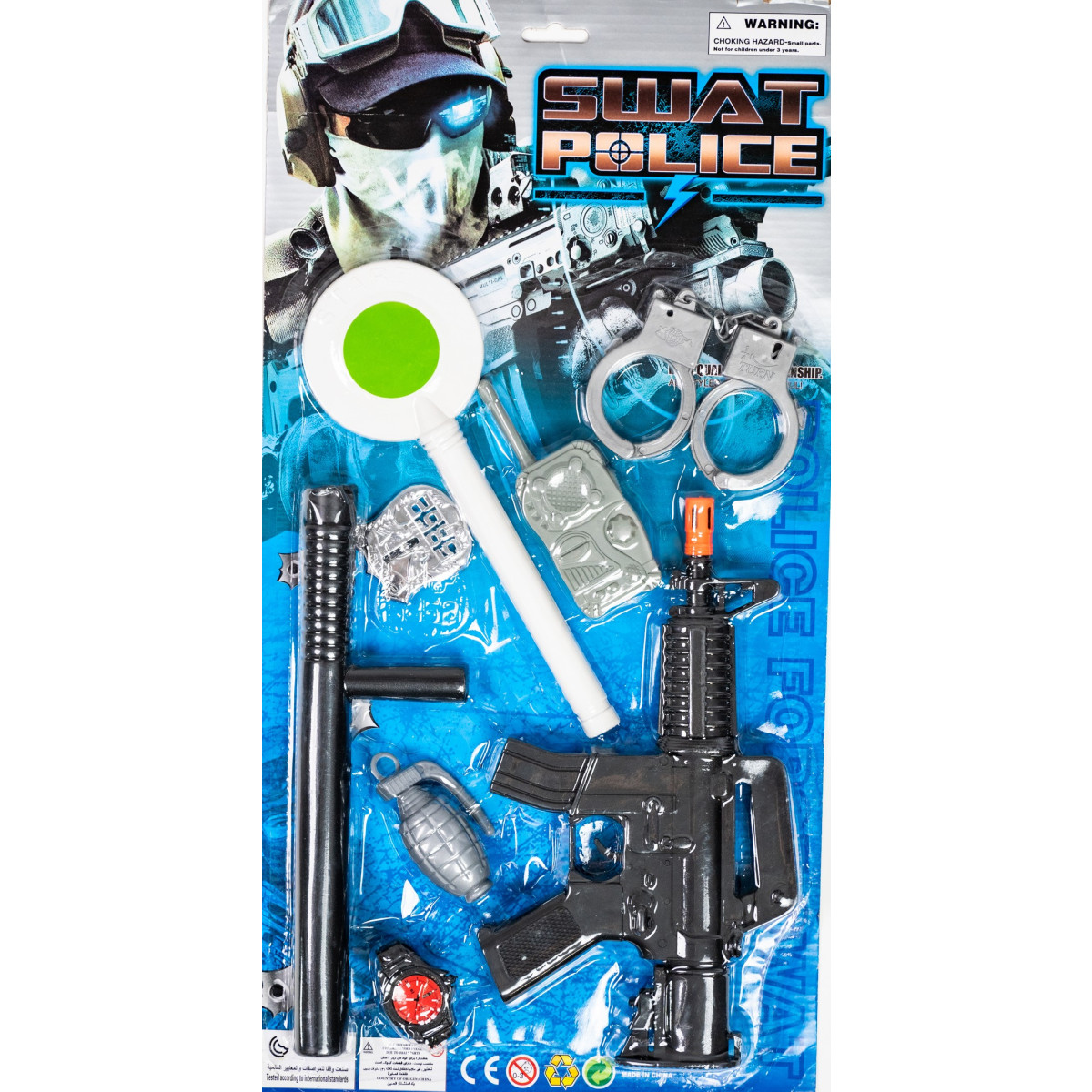 Policijski set vsebuje osem pripomočkov za Policaja specialca SWAT, Orožje in pripomočki za vestno opravljanje specialnih nalog.