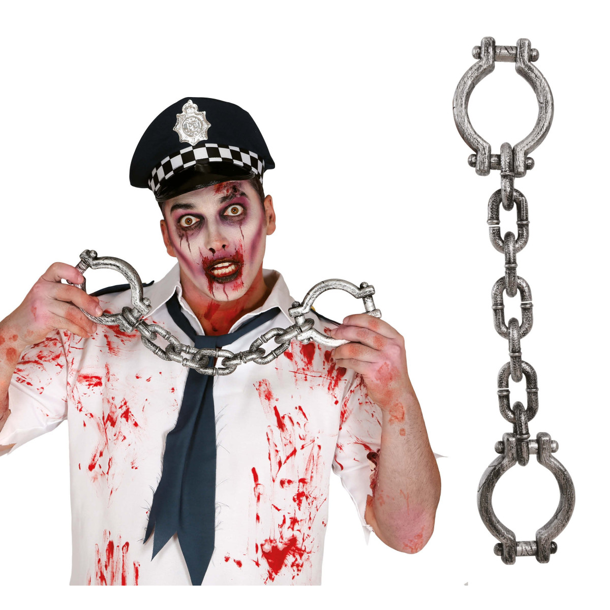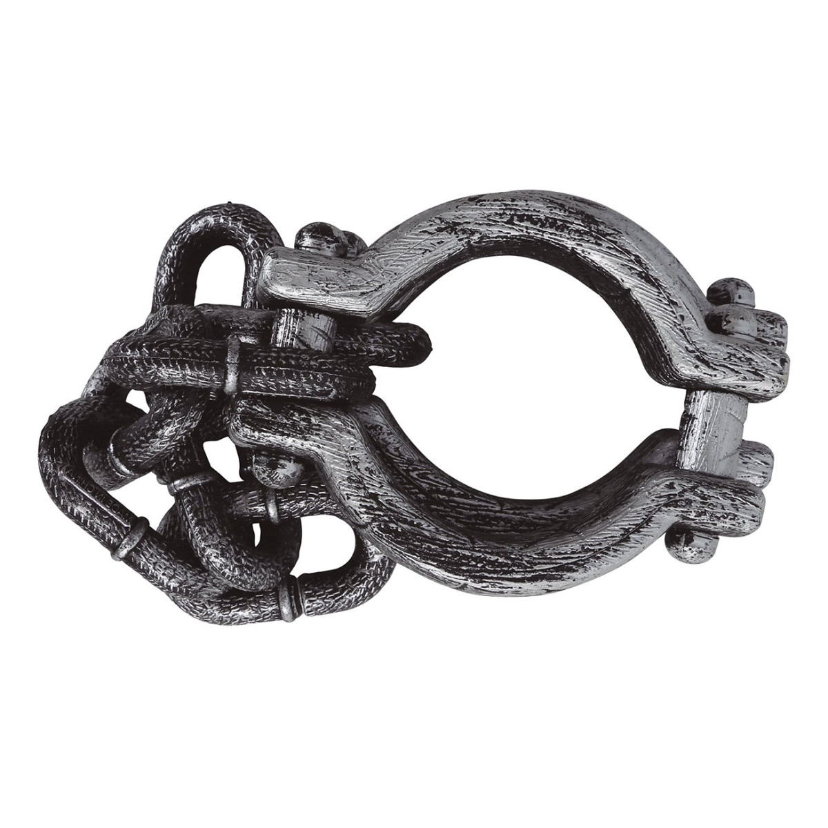 Zaporniško okovje je dodatek k pustnemu kostumu zapornika. Vključuje velike zapestnice z retro, starinskim izgledom. Okovje je iz lahke plastike in zasnovano tako, da spominja na kovinske zapornice, vendar je lahkotno in udobno za nošenje. S svojo temno barvo in robustnim videzom doda avtentičen pridih zaporniškega stila, kar je popoln zaključek za pustni kostum. Dolžina zapornice je 50 cm.