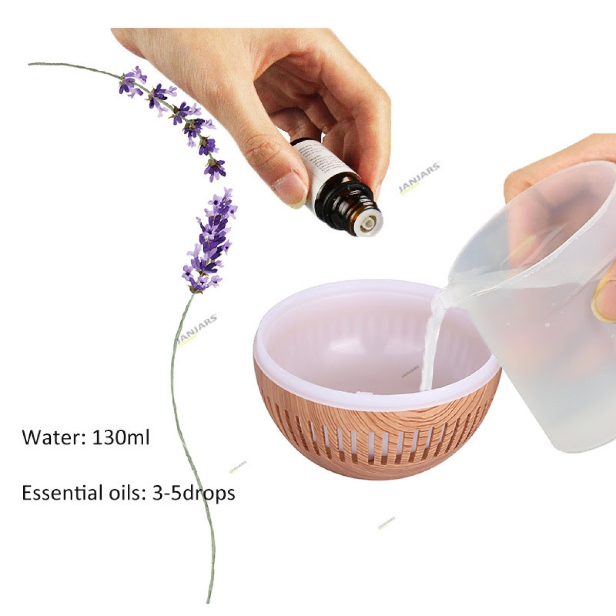 Prostornina difuzorja je 130ml. Difuzor vsebuje LED lučke, ki med puhanjem pare spreminjajo barvo ali pa jo enostavno izklopite. Razpršilnik deluje na napetosti 5 voltov. Napaja se preko USB kabla.