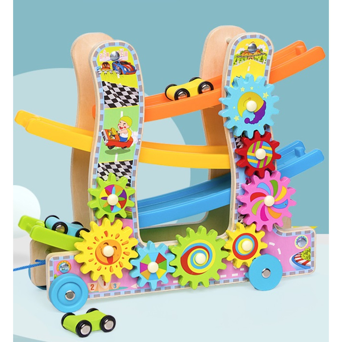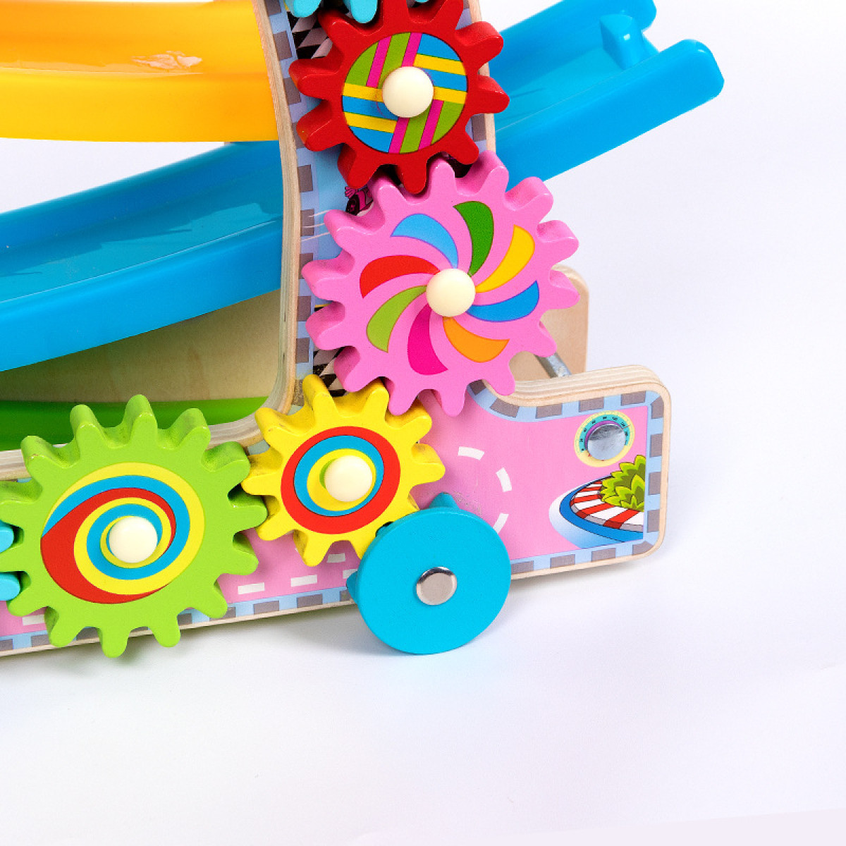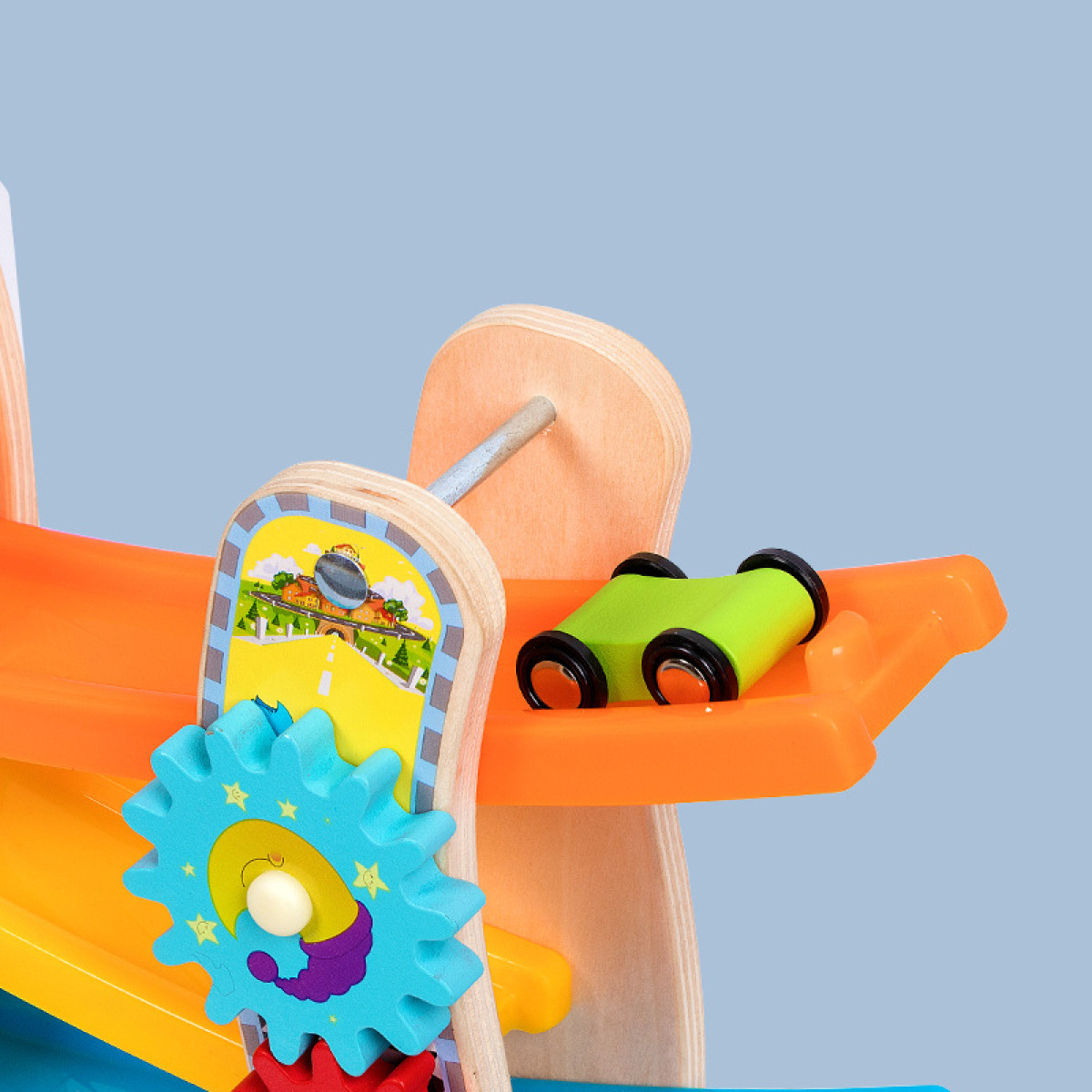 Avtomobilski tobogan je večstopenjski igralni pripomoček, ki prinaša malčkom ogromno veselja med spuščanjem svojih avtomobilčkov. Ta zabaven igralni tobogan je obenem tudi oblikovan kot vozilo, kar omogoča otrokom, da ga potiskajo ali vlečejo za sabo s pomočjo priložene vrvice. Med igro se bodo malčki navdušili nad vrtinčenjem raznobarvnih poslikanih zobnikov, kar spodbuja njihove ročne spretnosti in domišljijo. Ta igrača je odličen način za razvoj otrokovih motoričnih sposobnosti in ustvarjalnega razmišljanja.